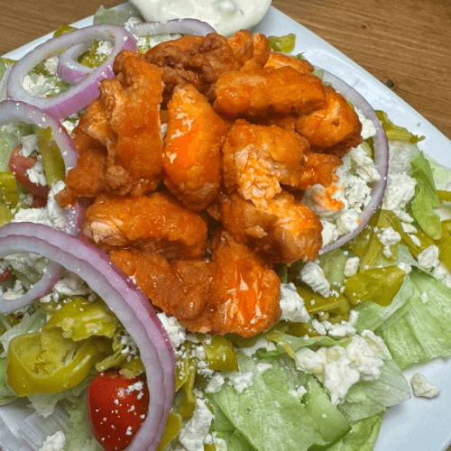Iceberg lettuce, crispy buffalo chicken, bleu cheese crumbles, pepperoncini, cucumber, tomato, red onion, and bleu cheese dressing