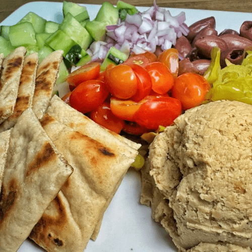 Romaine lettuce, Kalamata olive, feta, pepperoncini, cucumber, tomato, red onion, roasted garlic vinaigrette, and toasted rustic hummus flatbread
