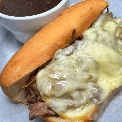 Slow roasted beef, sautéed onion, provolone, sub roll, and au jus