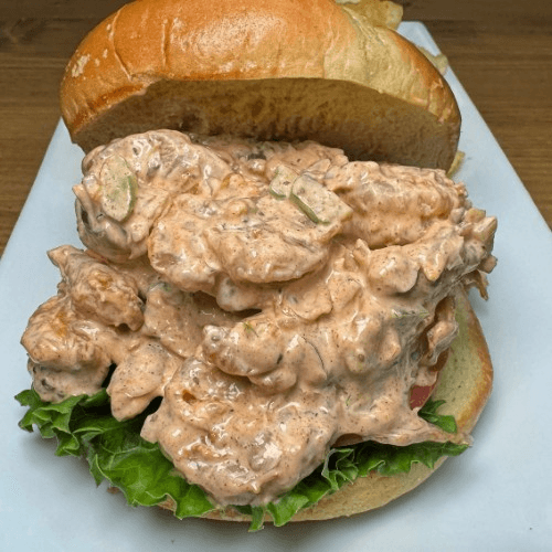 RBS shrimp salad, lettuce, tomato, and potato roll