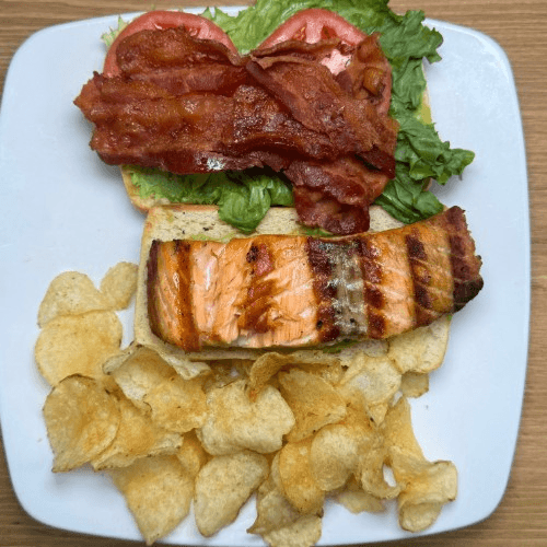 Grilled Atlantic salmon, bacon, avocado spread, lettuce, tomato, and toasted ciabatta bread