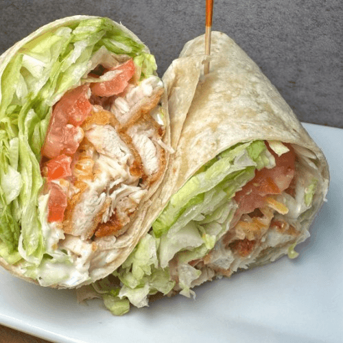 Crispy breaded chicken tossed in buffalo sauce , iceberg lettuce, tomato, and cheddar Jack