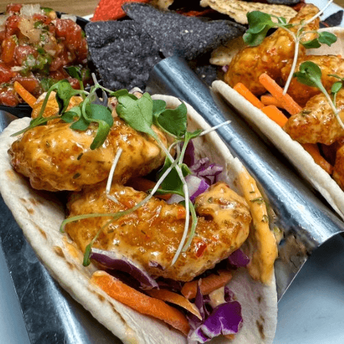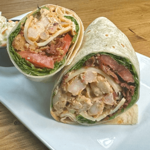 Crispy fried shrimp, boom boom sauce, cabbage, flour tortilla, tortilla chips, and RBS salsa