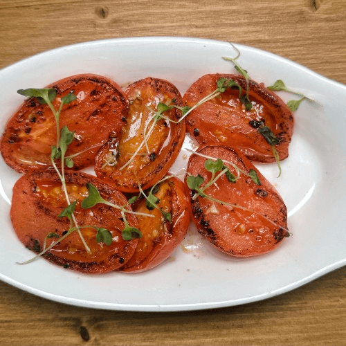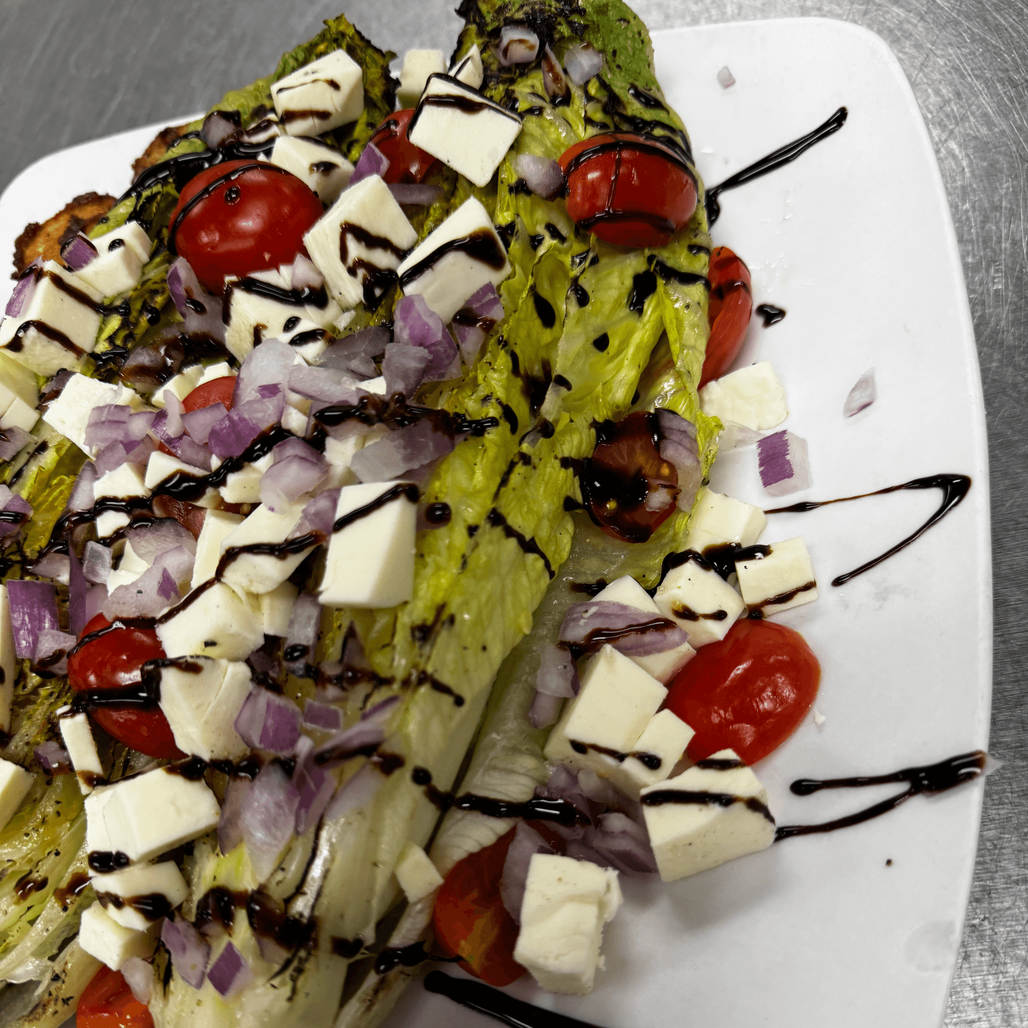 Grilled Romaine Heart, Sliced Mozzarella Cheese, Tomatoes, Red Onions, Balsamic Glaze, Balsamic Vinaigrette Dressing