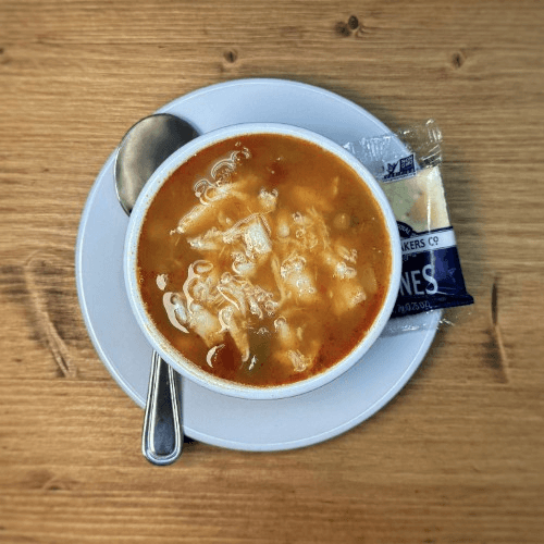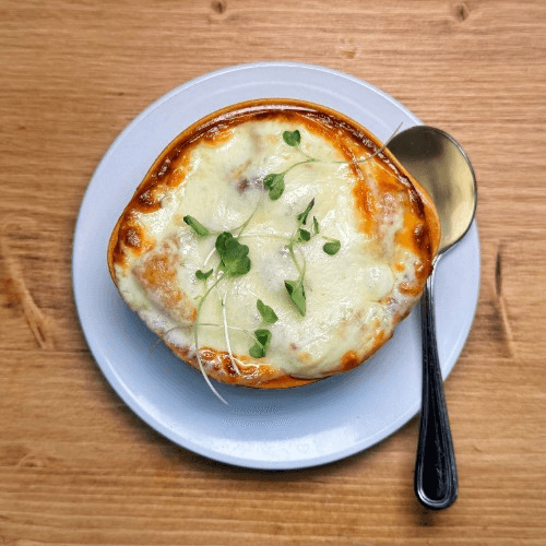 Croutons and provolone in beef base with sweet onions.