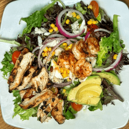 Mesclun greens, lump crab, old bay shrimp, grilled chicken, corn, sliced avocado, tomato, and red onion
