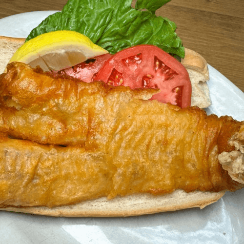 Atlantic white fish fillet, WMBC beer batter, lettuce, tomato, and sub roll