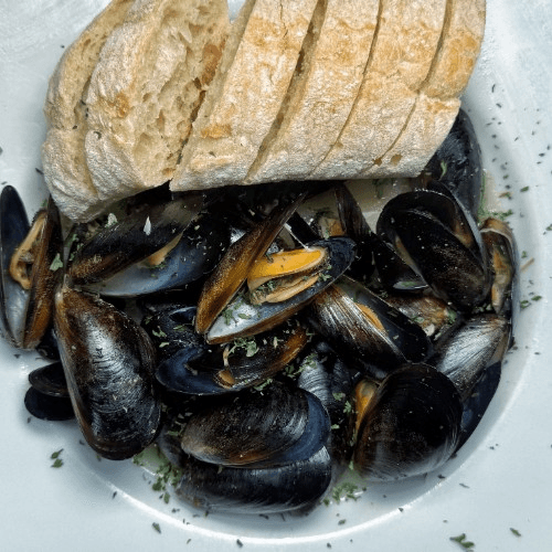 Pei mussels, white wine, garlic butter, lemon and French bread