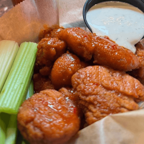10 pieces of boneless wings with choice of buffalo, BBQ, sweet & tangy, teriyaki, RBS jerk dry rub, honey old bay, old bay, or Parmesan truffle, with celery, and bleu cheese or ranch.