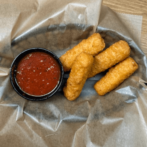 Four breaded and fried cheese sticks with marinara for dipping
