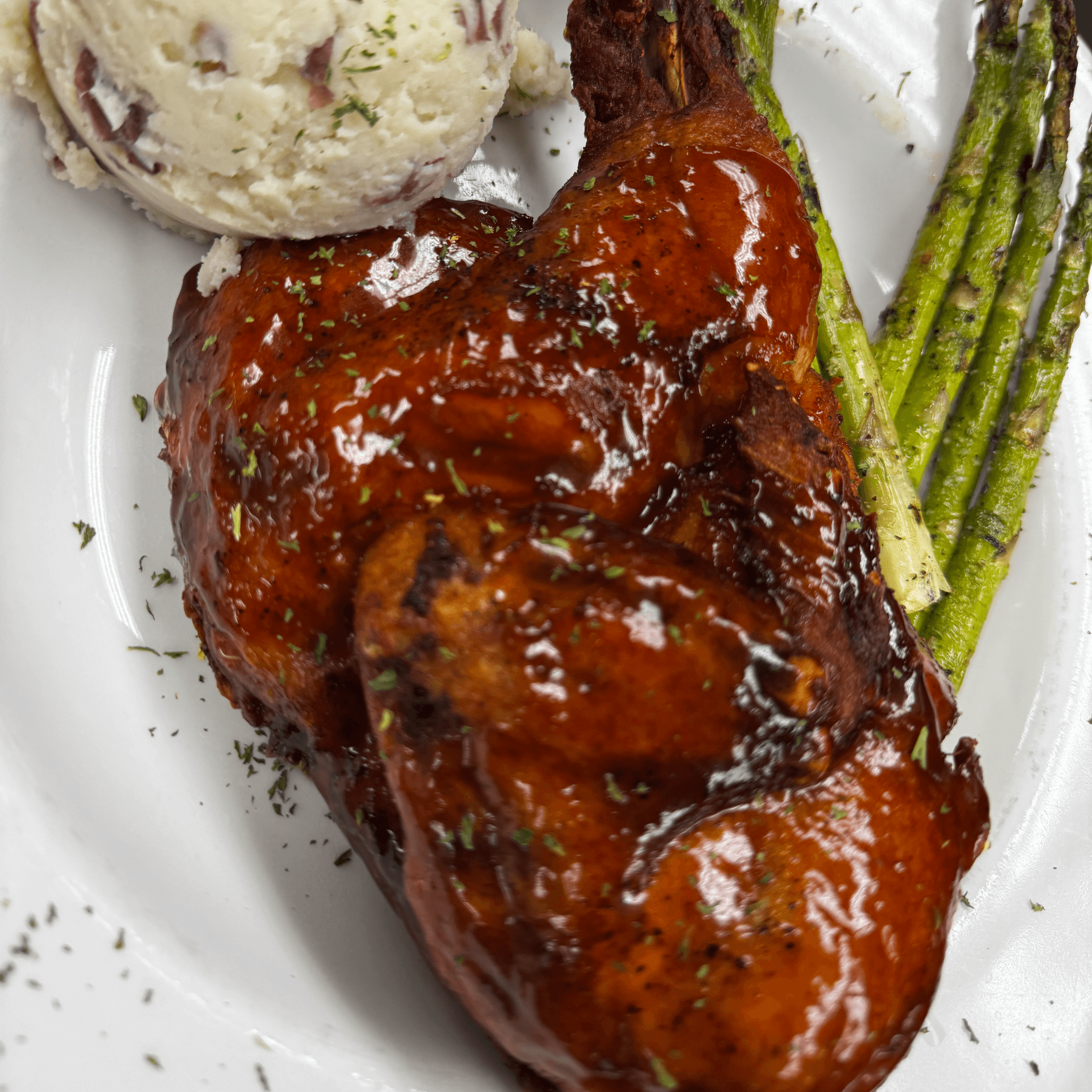 Honey Brown Sugar BBQ, Smashed Red Potatoes, Grilled Asparagus