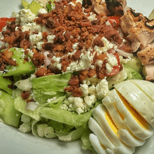 Iceberg lettuce, bacon, hard boiled egg, bleu cheese crumbles, cucumber, tomato, and red onion