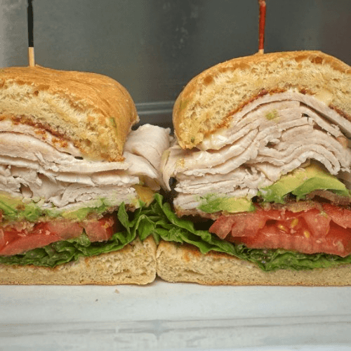 Roasted turkey breast, bacon, lettuce, tomato, avocado, mayonnaise, and toasted ciabatta bread