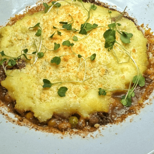 Lamb, beef, onion, corn, carrot, peas, and Yukon gold mash